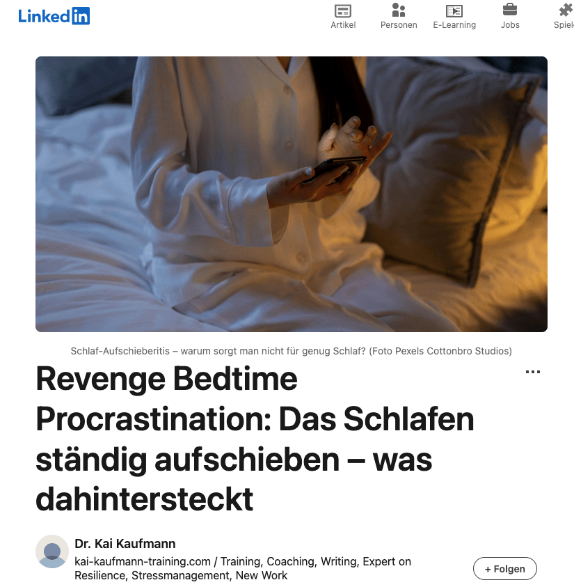 Immer zu spät ins Bett… Die neuere Forschung zeigt, dass dieses Verhalten oft mit einer geringen Zukunftsorientierung zusammenhängt. Für Führungskräfte ist das ein besonderes Problem. Plus: Tipps gegen Schlaf-Aufschieberitits. Hier geht es zu meinem Artikel für LinkedIn…