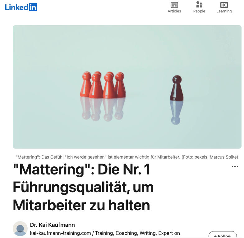 Ohne das Gefühl „Ich werde gesehen und bin euch wichtig“ können Mitarbeiter ernsthaft krank werden. In der neueren Forschung heißt dieses Gefühl „Mattering“. Laut dem Magazin „Forbes“ ist es die wichtigste Führungsqualität überhaupt – gerade in Zeiten von Remote Work. Hier meine Tipps für Führungskräfte und mehr „Mattering“ im Unternehmen… Mehr zu diesen Themen auch in meinem 2-tägigen Resilienztraining vom 31.03.2025 – 01.04.2025 im Beach Motel an der Nordsee –…