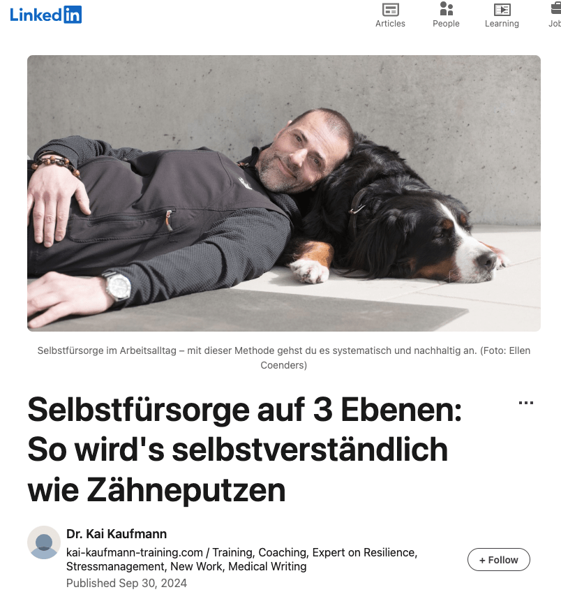 Es mag ein blumiges, etwas abgegriffenes Wort sein – Selbstfürsorge. Doch mit dieser Methode kümmerst du dich systematisch und nachhaltig auch im Arbeitsalltag um dein Wohlbefinden. Du verankerst Selbstfürsorge in deinem Gehirn, lässt sie so selbstverständlich wie das tägliche Zähneputzen werden. Und du sorgst für dich auf drei zentralen Ebenen. Mache daraus eine Challenge für eine Woche!